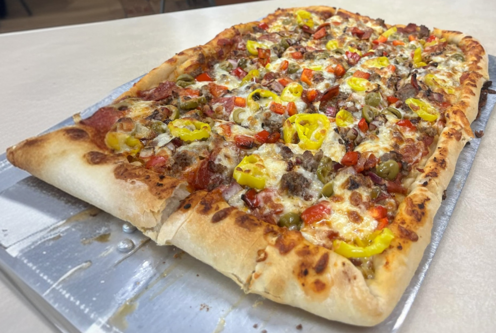 Picture this: a homemade crust topped with beef, sausage, and pepperoni for that meaty base. Then, add onions and red bell peppers for a touch of sweetness. But here’s where it gets interesting – green olives and banana peppers. These two ingredients elevate the “Super Freak” from a standard meat lover’s pizza to a flavor explosion.