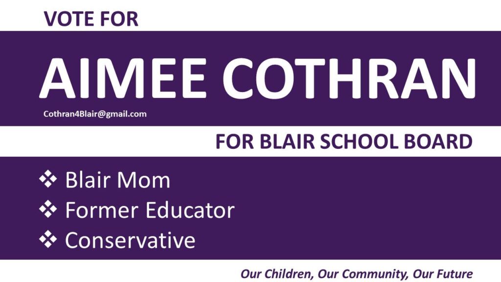 FROM BLAIR TODAY STAFF: Current School Board members should take note of Aimee’s candor. And, although we don’t endorse any candidates as of this interview, we do appreciate open, honest, and strong opinions. If you vote next year – which you should – we believe if a candidate won’t answer directly about what they believe, you should VOTE THEM OUT.