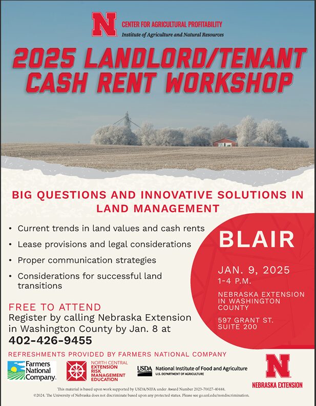 Jansen, along with fellow UNL agricultural economist Anastasia Meyer, will lead the 2025 Landlord/Tenant Cash Rent Workshop on January 9 at the Nebraska Extension Office in Washington County.